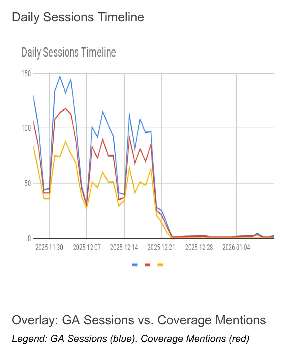 - GA4 tracks traffic spikes and behavior tied to coverage windows